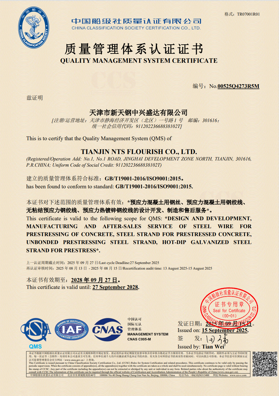 TIANJIN NTS FLOURISH CO.,LTD. is one of the earliest professional manufacturers engaged in the production of prestressed steel strands in China. Its predecessor was Tianjin Metallurgical Group Flourish Steel Industry Co., Ltd. With a long history of 60 years, it is currently one of the enterprises under the Delong Iron and Steel Group, which ranks among the world's top 500. The company is located in Jinghai Economic Development Zone, Tianjin, covering an area of 800,000 square meters.In China, Tianjin NTS Flourish Co., Ltd. ranks first in the market share of prestressed steel strands. In 2025, the sales volume of prestressed steel strands reached 516,000 tons; among which, the export volume was more than 100,000 tons, and it has been exported to more than 20 countries and regions successively.